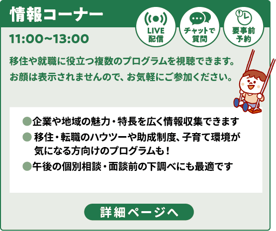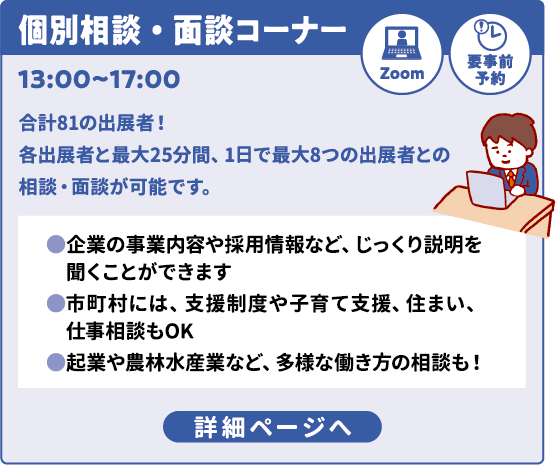 気軽に参加できる「情報コーナー」と、じっくり相談できる「個別相談・面談コーナー」の2つをご用意しました。